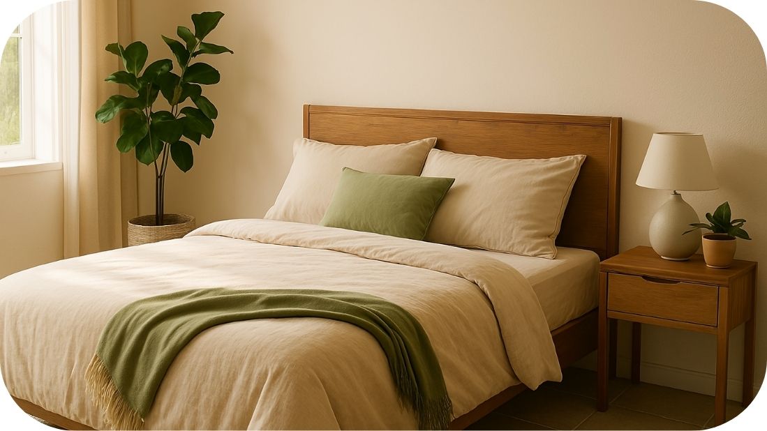 U spavaćoj sobi, posteljina od pamuka, nežni zemljani tonovi i biljka na komodi mogu doprineti osećaju mira koji traje i nakon buđenja.