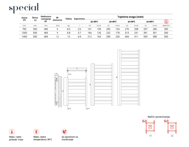 Snaga grejanja (∆T60) zavisi od izabrane visine i kreće se od 260 do 505 W, pa je odličan izbor kao praktičan sušač i dopunski izvor toplote – posebno u jutarnjim i večernjim satima, kada se razlika najviše oseća.
