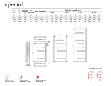 Visina je dostupna u rasponu od 915 do 1615 mm, dok je širina 600 mm.