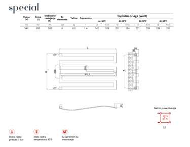 Snaga grejanja (ΔT60) zavisi od izabrane završne obrade i kreće se od 261 do 339 W, što ga čini idealnim kao dodatni grejač i sušač peškira kada želite prijatan osećaj toplote bez pregrevanja prostora.
