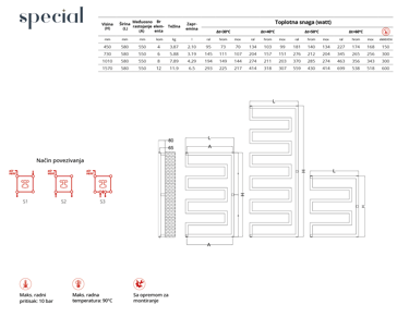 Snaga se kreće od 168 do 699 W (ΔT 60°C), što ga čini dobrim izborom i za manje kupatilo, ali i za prostore gde želite izraženiji učinak grejanja.