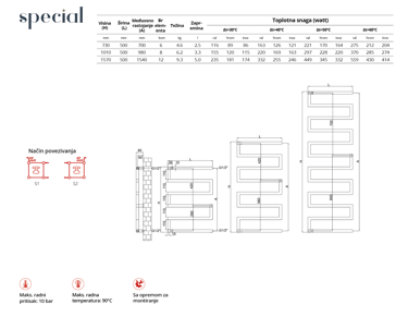Serpentine je dostupan u visinama od 730 do 1570 mm, pa se lako bira prema prostoru: niži modeli su sjajan izbor za kompaktna kupatila, dok viši daju više mesta za peškire i vizuelno “izdužuju” zid.