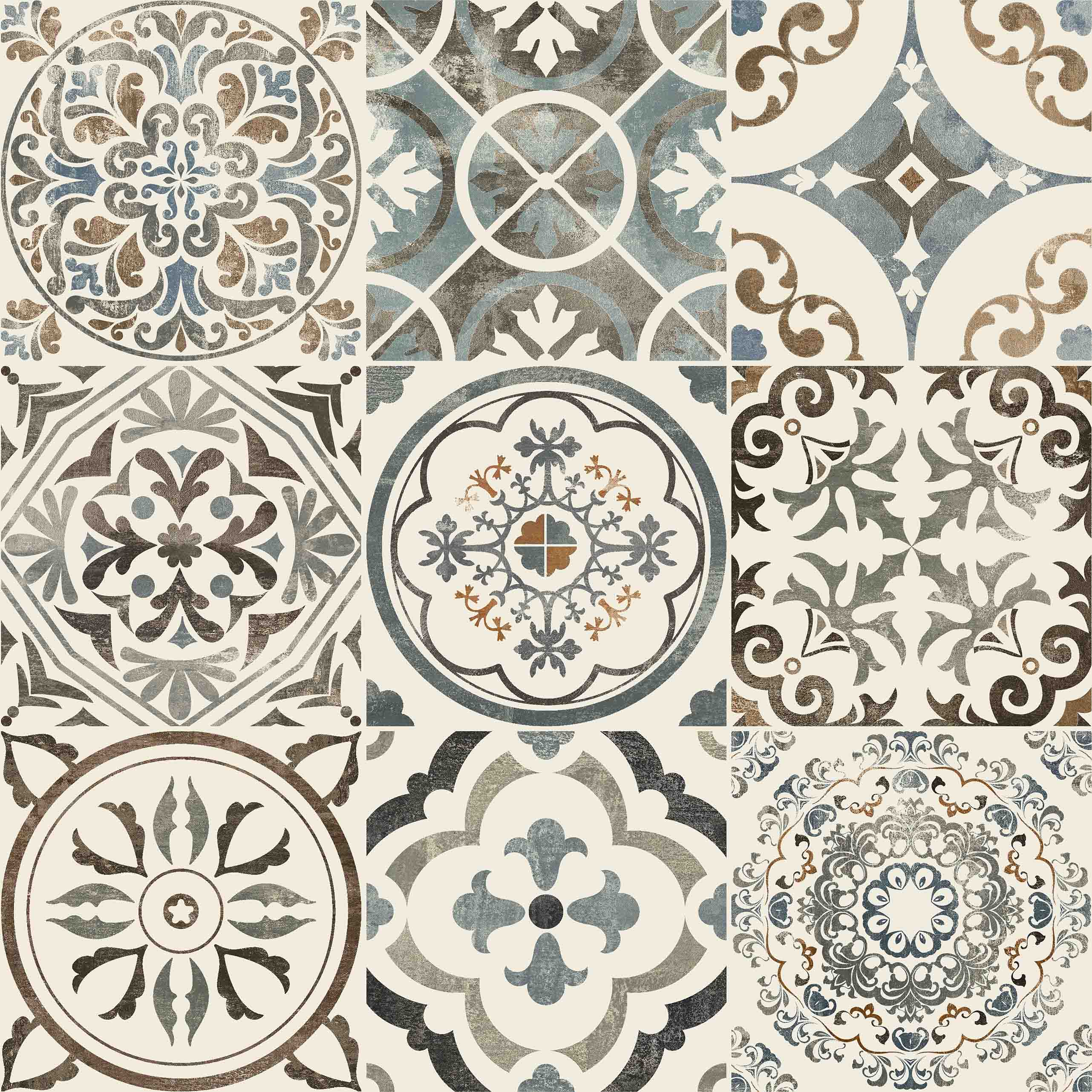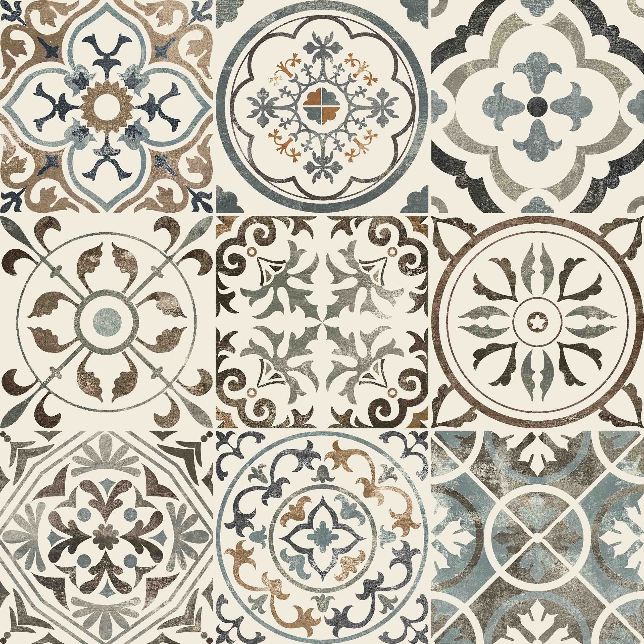 Na svetloj osnovi raspoređeni su raznoliki ornamentalni motivi u nijansama braon, plave i sive, koji podsećaju na mozaik.