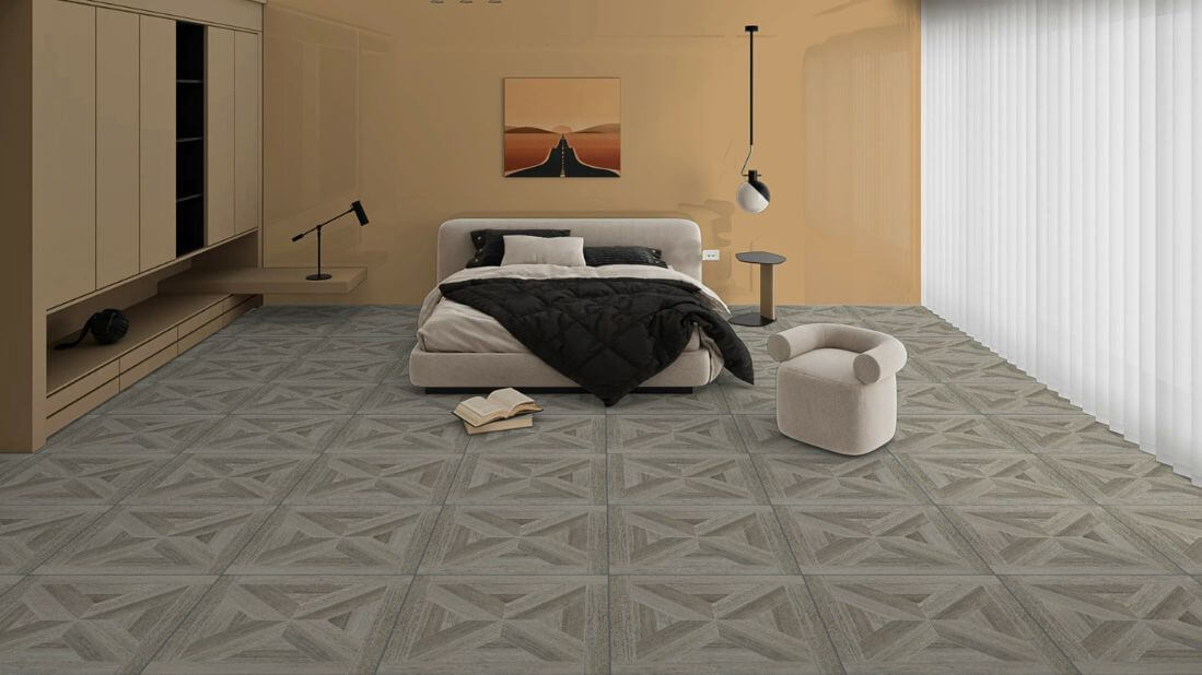 Beldevere Oak 60x60cm je pločica koja unosi posebnu dinamiku u prostor zahvaljujući svom geometrijskom parket dezenu.