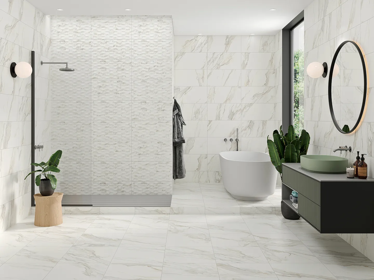 Format 30x60cm pruža uredan ritam postavke, dok nerektifikovane ivice dodatno ublažavaju linije spojeva.