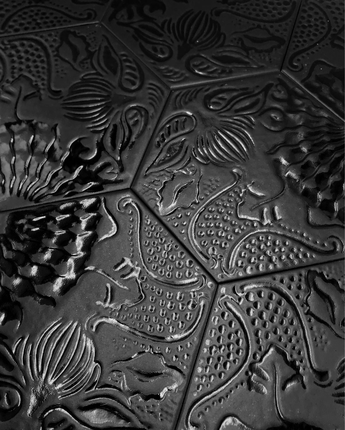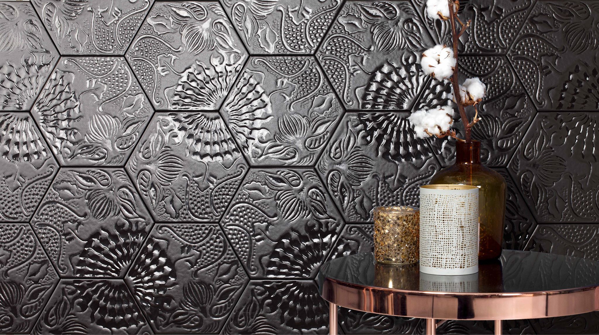 Hex 25 Gaudi Lux Black donosi snažan vizuelni akcenat kroz reljefni heksagon oblik i sjajnu završnu obradu koja reflektuje svetlost i naglašava dubinu dekora.