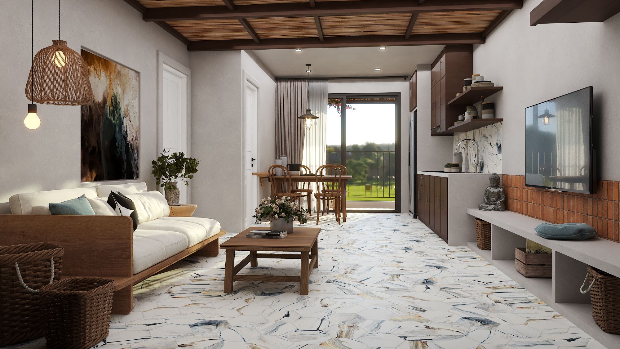 Umesto snažnog kontrasta, ovde dominira miran vizuelni tok koji prostoru daje osećaj otvorenosti i lakoće.