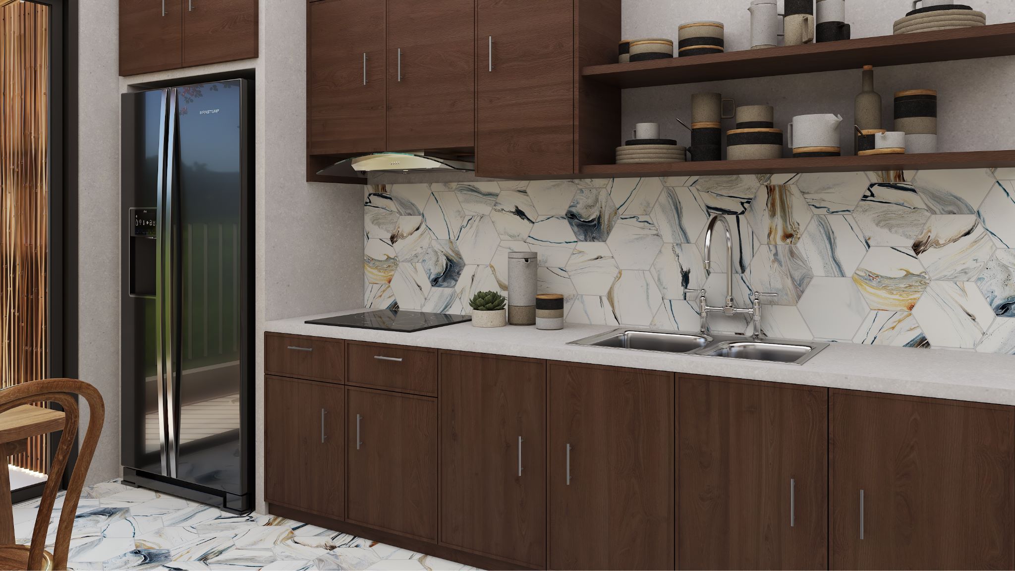 Heksagon format dodatno razbija pravilnost površine i unosi nenametljivu dinamiku, bez vizuelnog opterećenja.