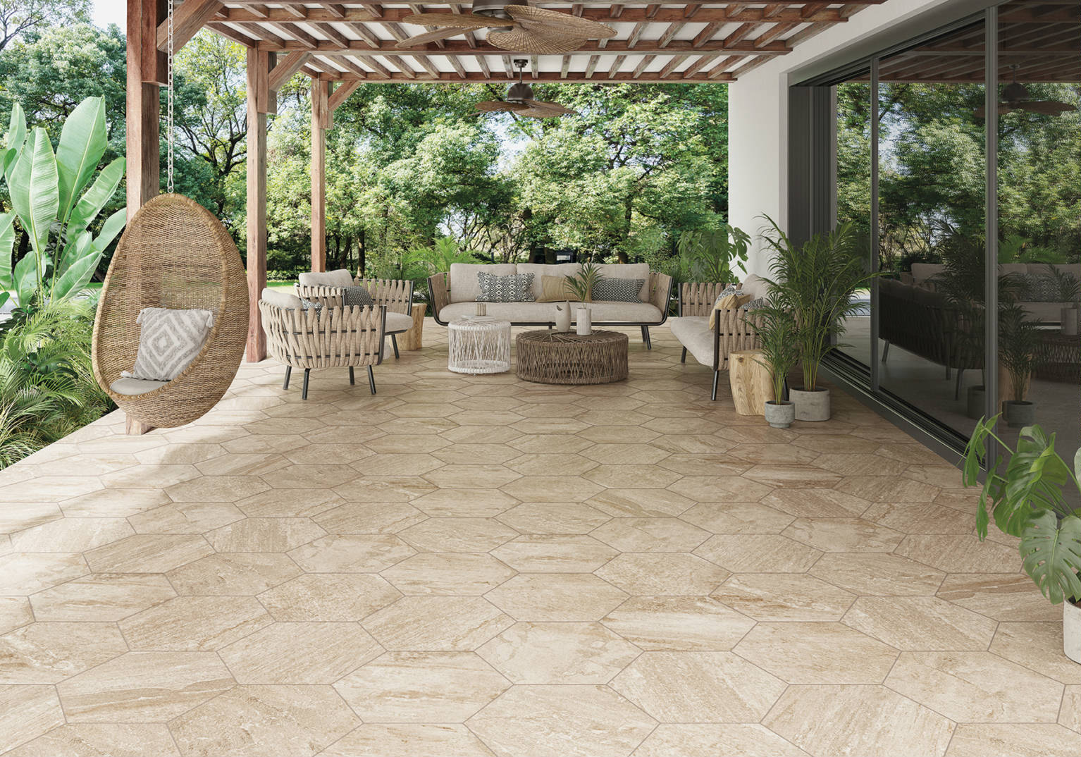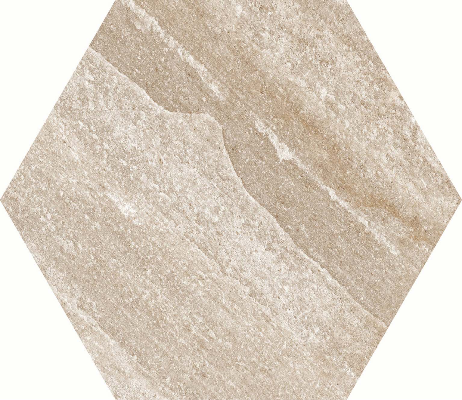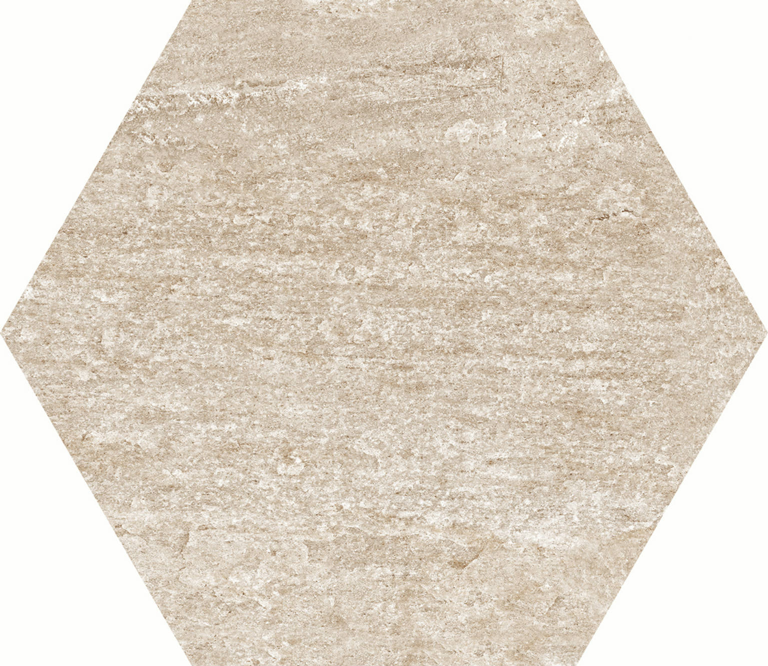 Peščani ton ostavlja prostor za kreativne detalje i nameštaj, dok velika heksagon forma daje podu jasan identitet.