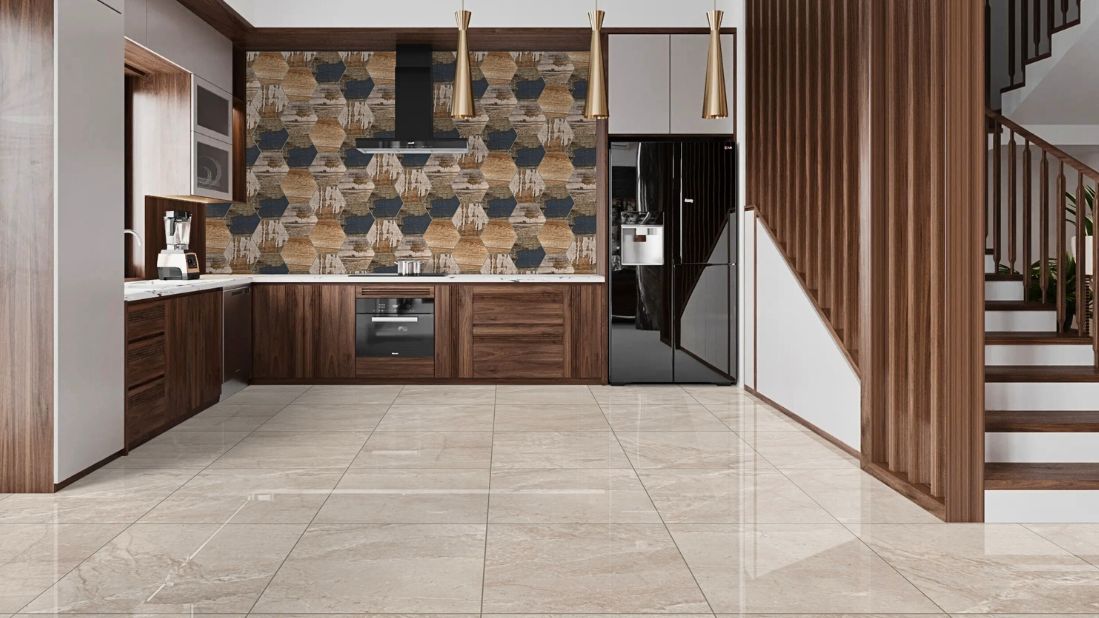 Zahvaljujući neutralnoj nijansi i elegantnom sjaju, može se koristiti i za podove i za zidne površine, naročito u zonama koje se vizuelno povezuju — poput kuhinje i trpezarije u istom prostoru.