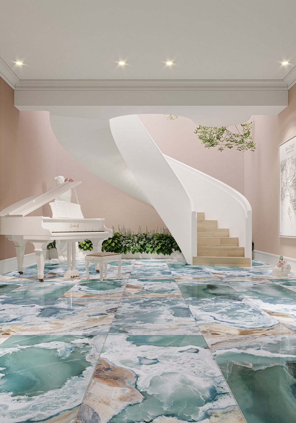 Ova kombinacija nežnih nijansi plave, bež i bele, podseća na pokret mora, obalu i mineralne slojeve, unoseći u prostor energiju, svežinu i dubinu.