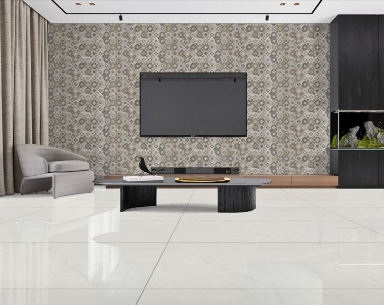 Bela osnova sa blagim mermernim šarama daje neutralan ton prostoru, otvarajući mogućnosti za različite stilove – od minimalističkih do klasično elegantnih.