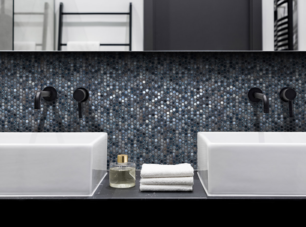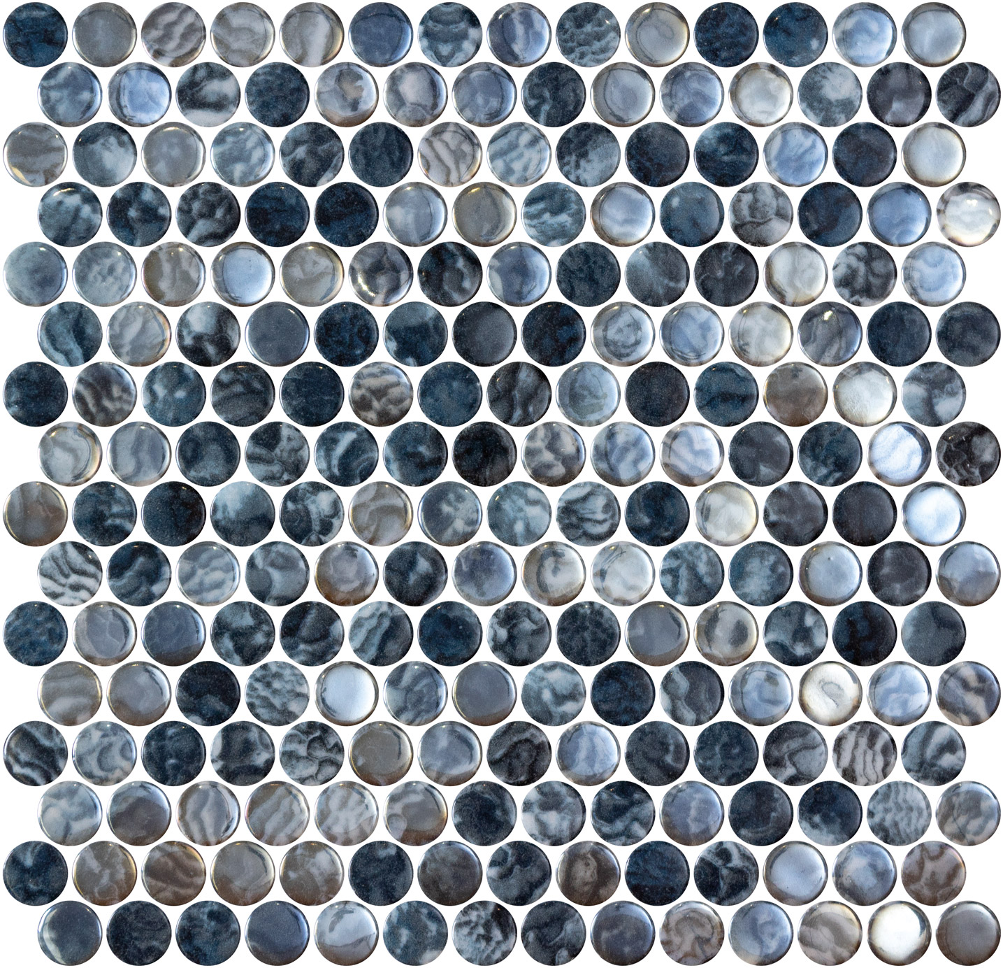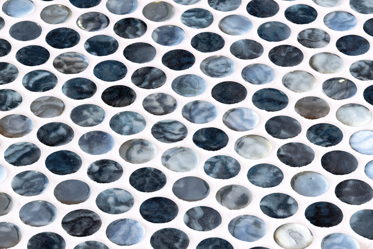 Onix stakleni mozaik PENNY ARRECIFE IRIDIS GREY donosi sofisticiranu igru svetlosti kroz sjajnu, kružnu strukturu mozaika u crno-plavim nijansama.