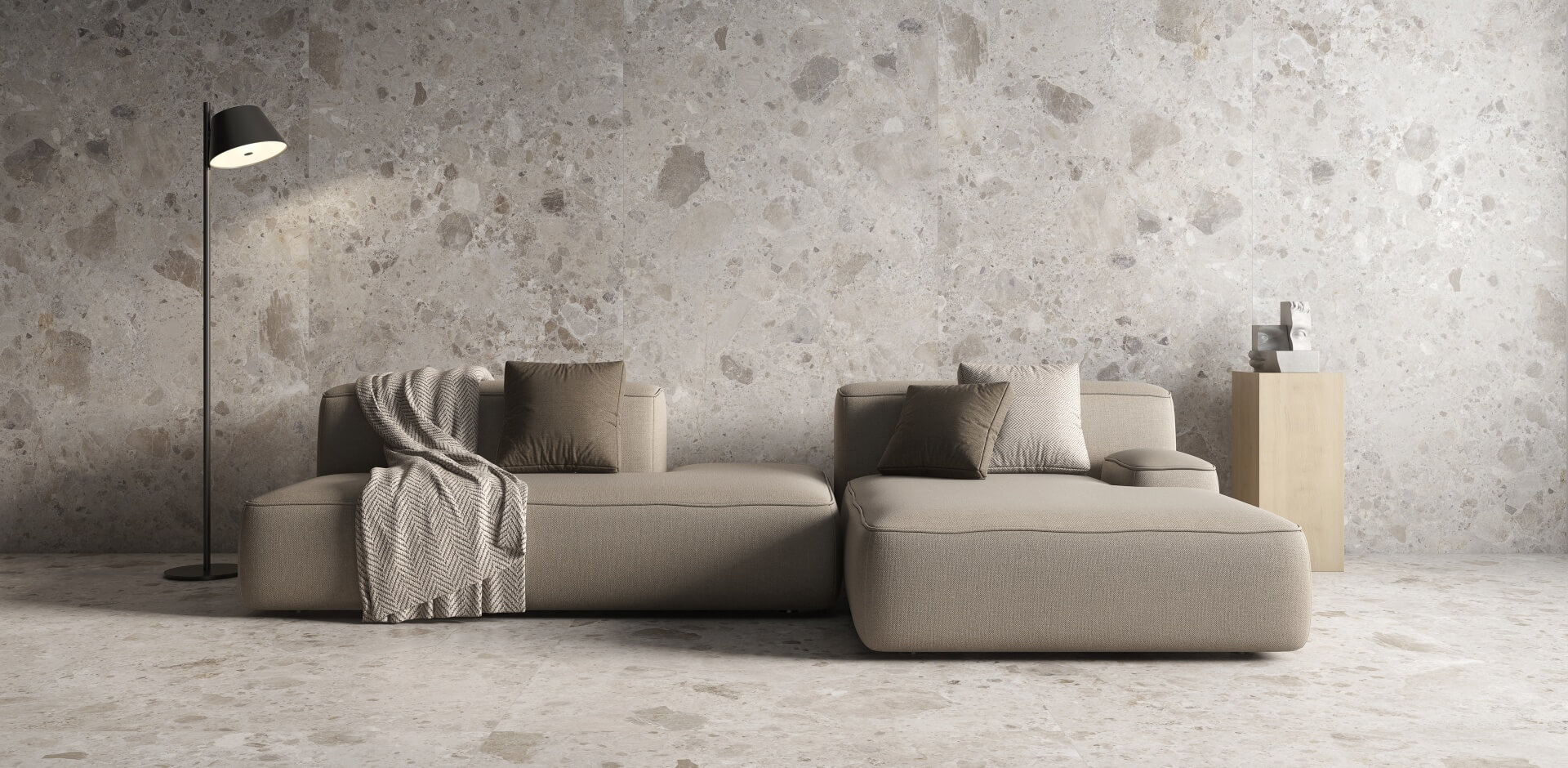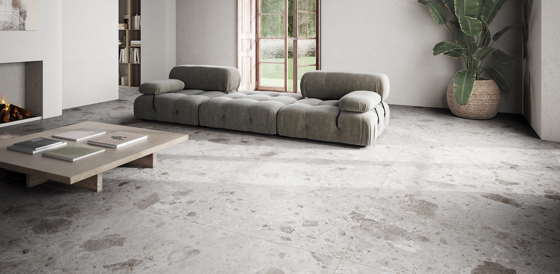 Granitne pločice Petra Grey 60x120cm španskog brenda Argenta Ceramica osvajaju već na prvi pogled zahvaljujući prefinjenoj Terazzo strukturi i prirodnoj paleti sivih tonova.
