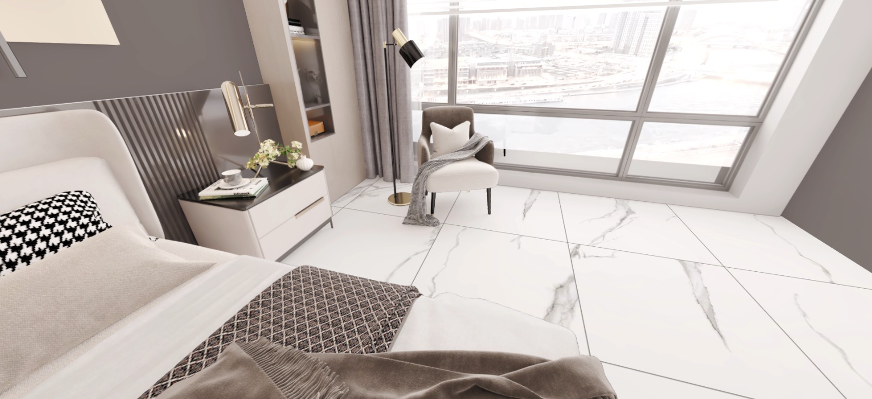 Beli ton nije hladan, već savršeno uravnotežen – dopunjen diskretnim linijama koje imitiraju prirodni mermer.