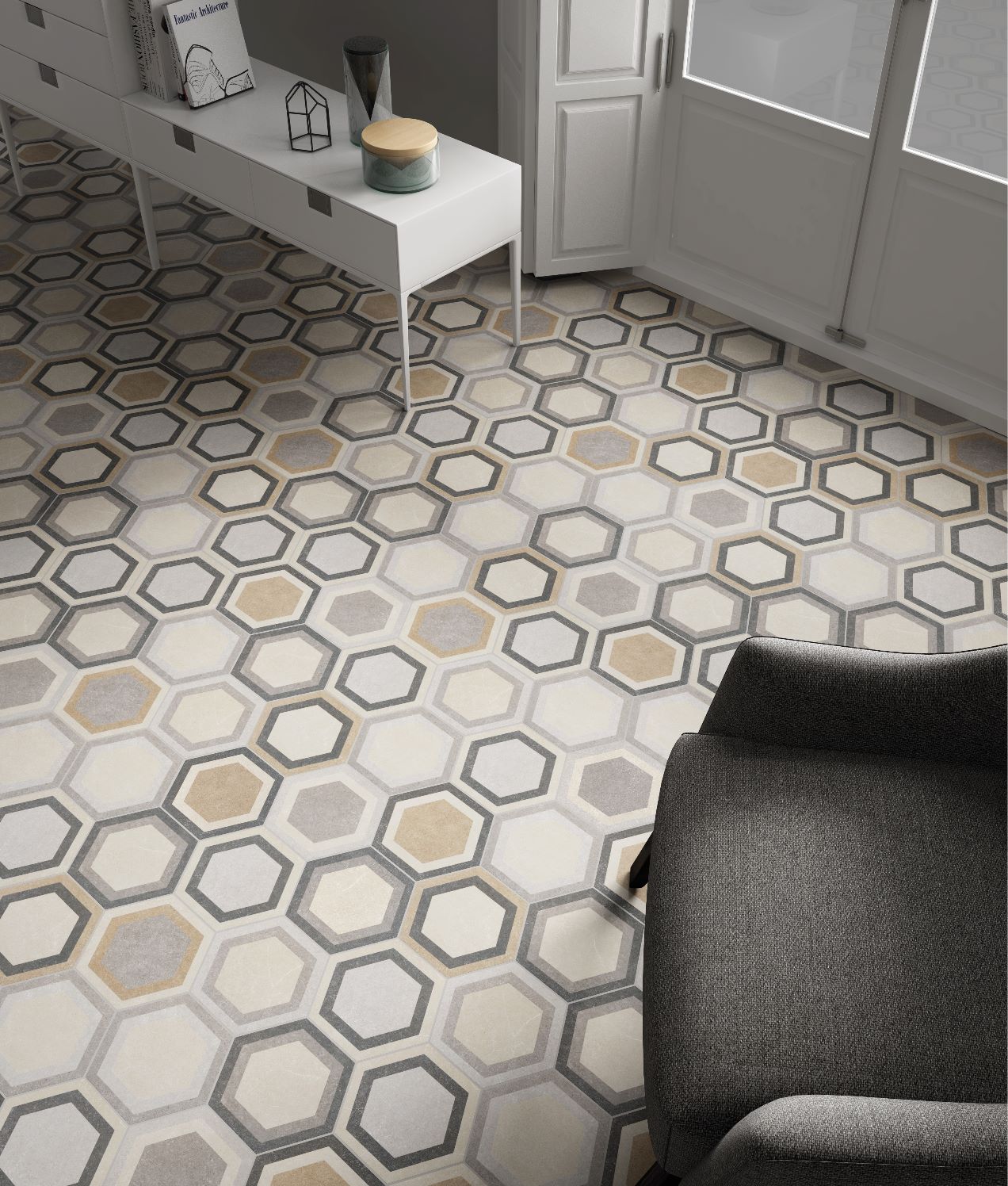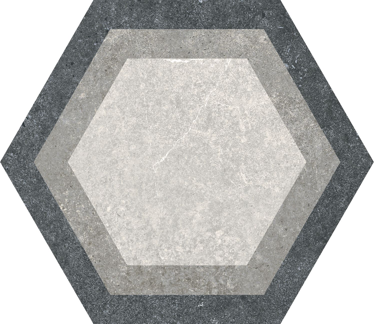 Traffic Combi Hex 25x22cm granitne pločice nude savršen balans između modernog grafičkog dizajna i suptilne elegancije.
