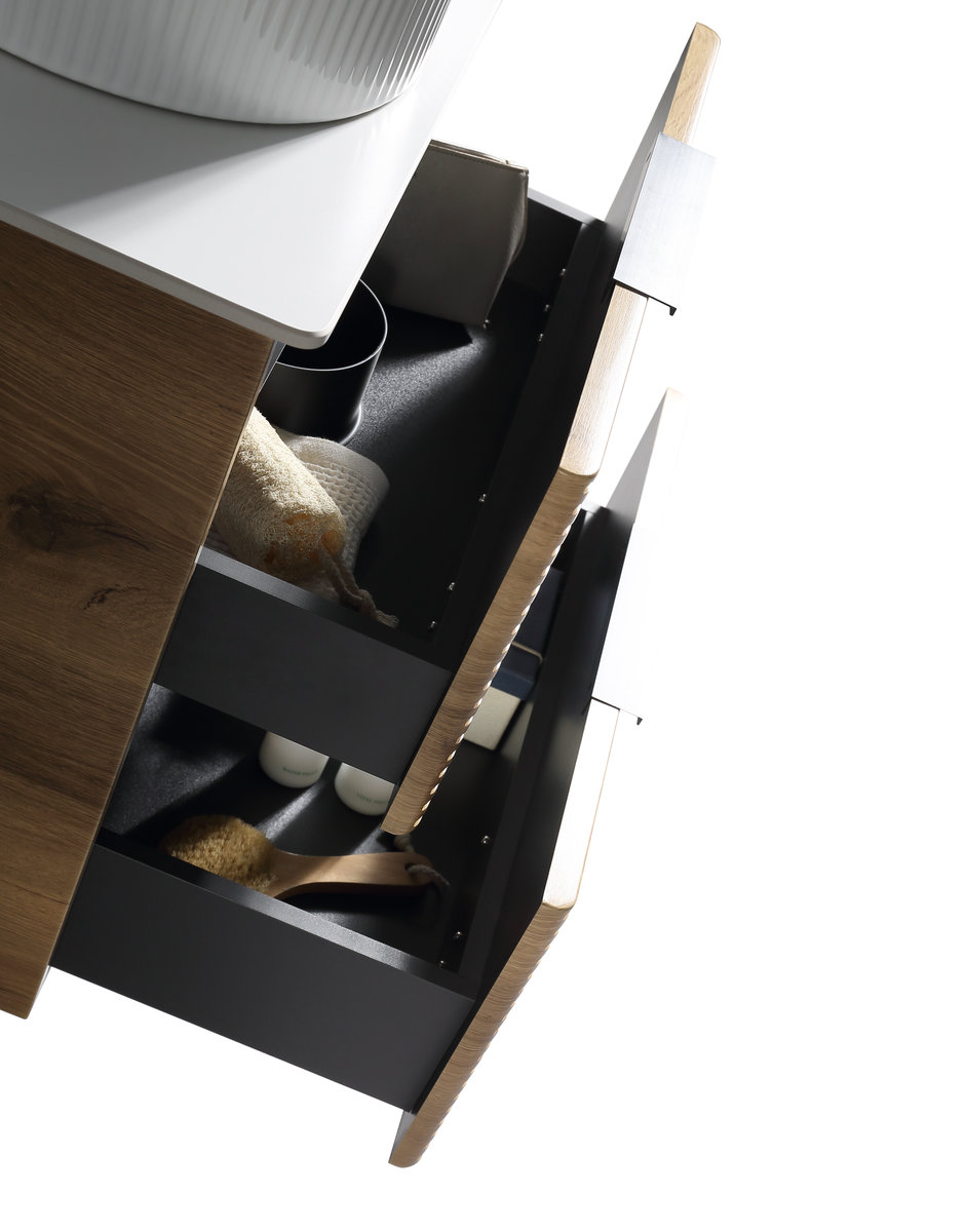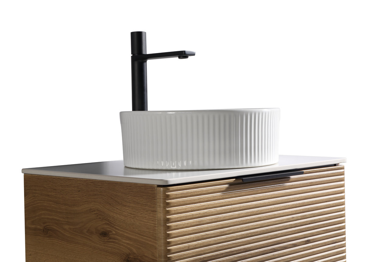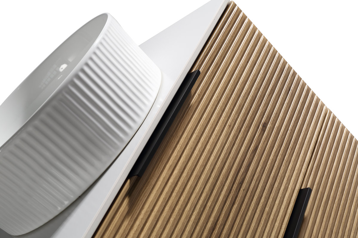 U kombinaciji sa belom pločom i nadgradnim lavaboom dobija se jasan kontrast – svetla površina naglašava formu, dok drveni dekor unosi toplinu.