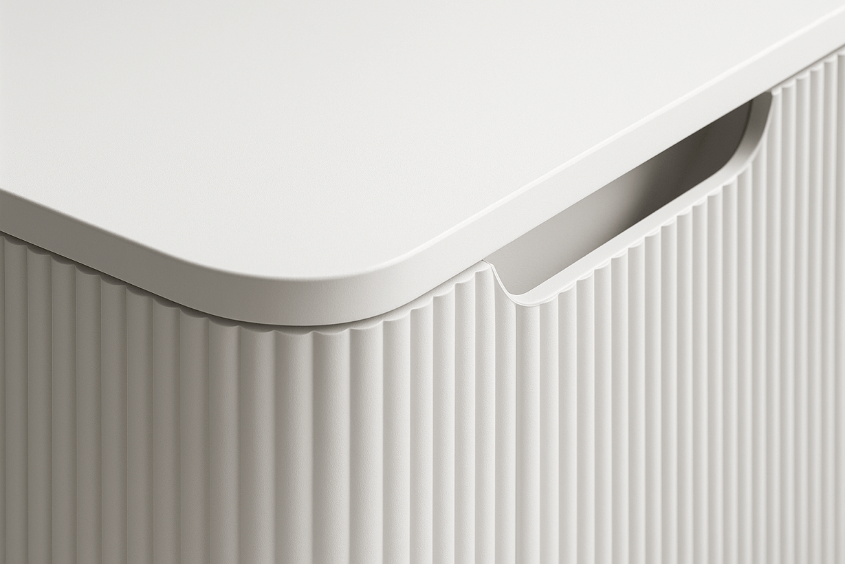Front ormarića krasi vertikalno strukturirana površina, koja unosi dinamiku i teksturu u enterijer.
