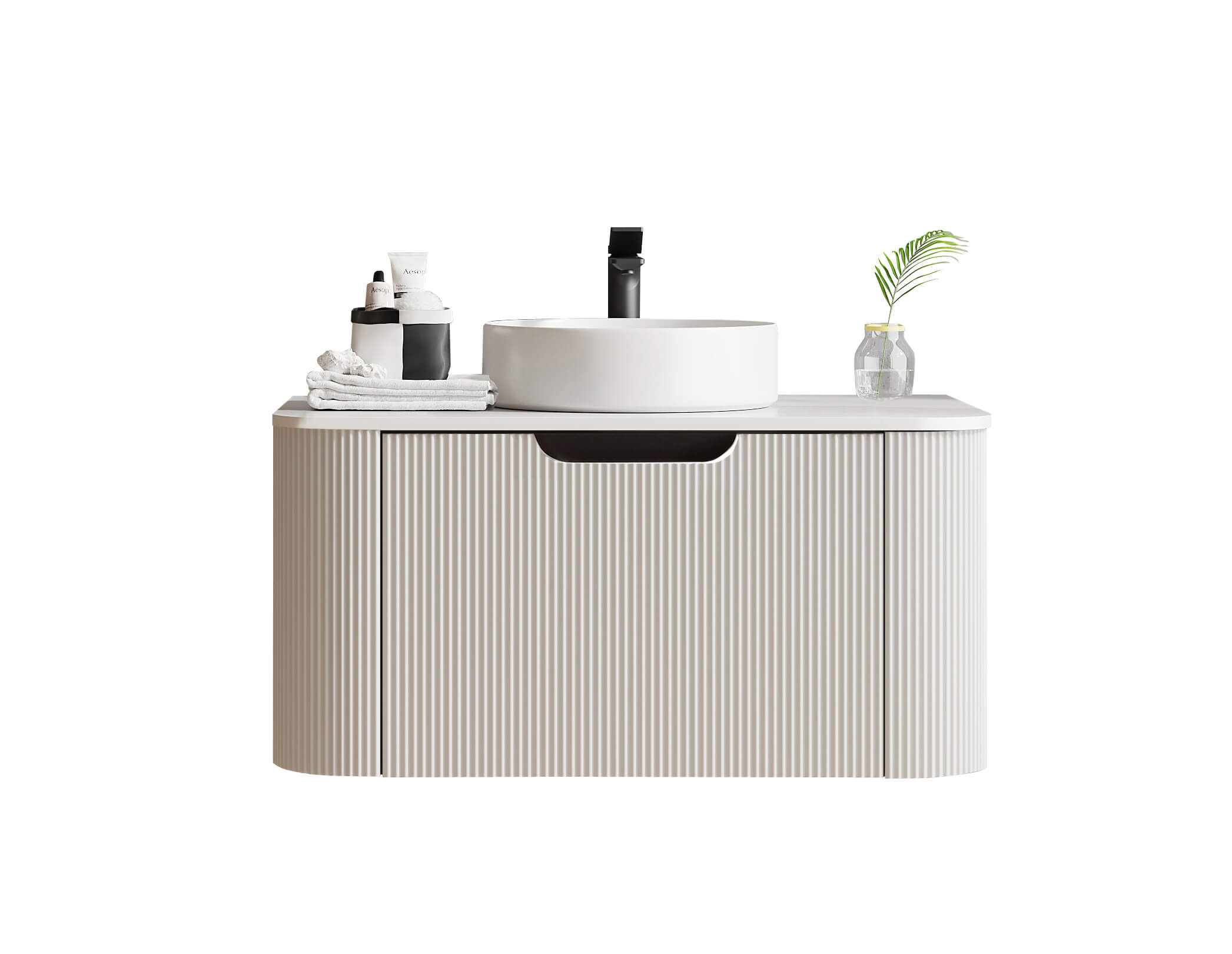 Viseći ormarić Elegant 75 u nijansi Silk White donosi savremenu interpretaciju klasične bele boje, obogaćenu diskretnim reljefnim frontom i zaobljenim ivicama.