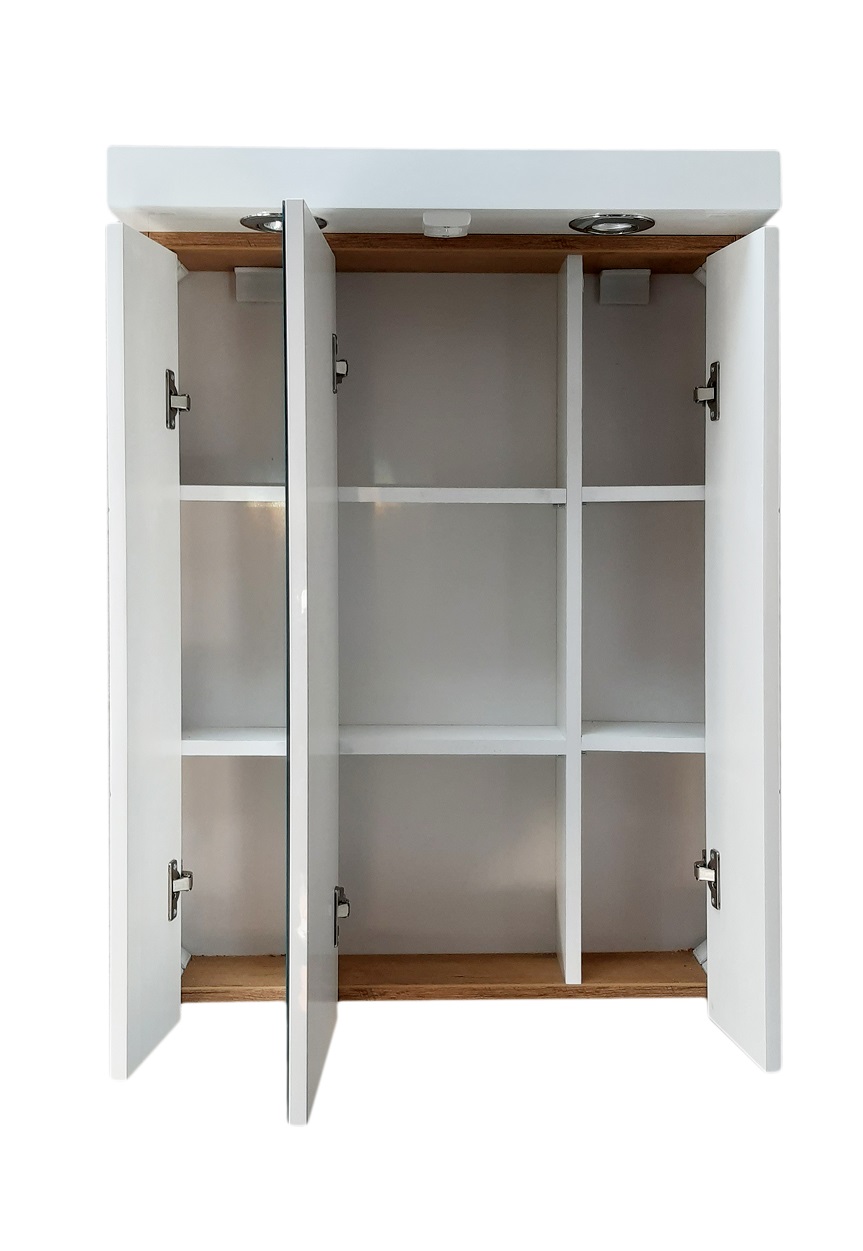 Ugrađeno osvetljenje dodatno doprinosi funkcionalnosti – idealno je za jutarnje spremanje ili večernju rutinu, a ugrađena utičnica omogućava povezivanje električnih uređaja poput fena, brijača ili punjača za četkicu za zube.