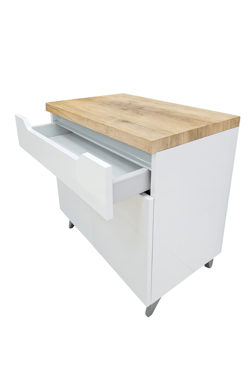 ✔ Kombinacija toplog i modernog – bela površina visokog sjaja i drvena ploča