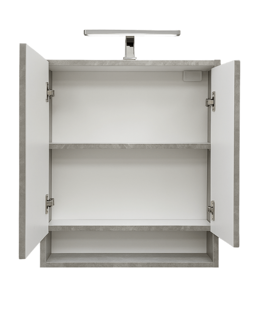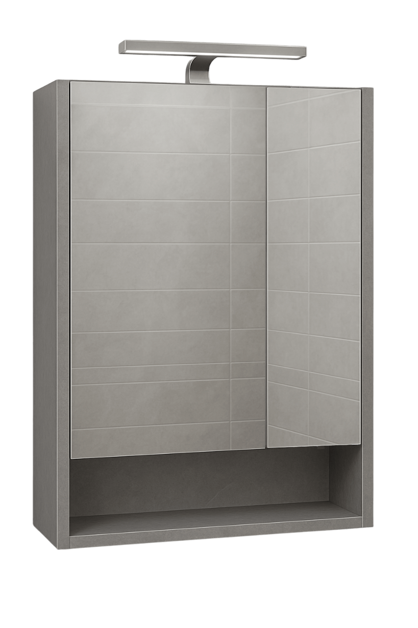 Ormarić sa ogledalom Akva Glina 65cm unosi eleganciju industrijskog stila u kupatilo kroz sivu mat teksturu u izgledu cementa, ravne linije i praktičnu organizaciju.