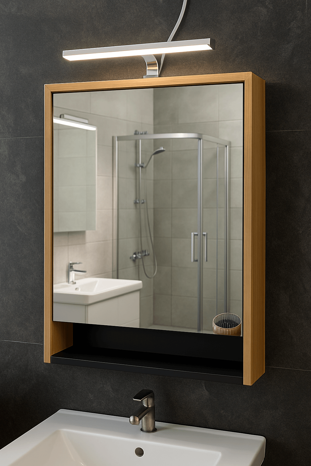 Ispod ogledala nalazi se praktična otvorena crna polica – savršena za svakodnevne sitnice koje želite da budu nadohvat ruke.