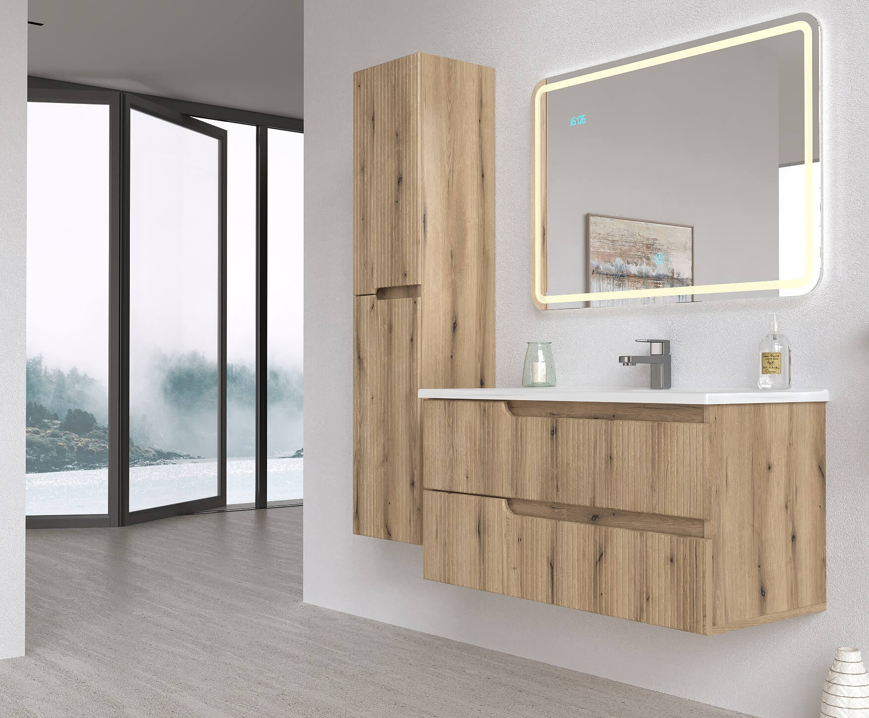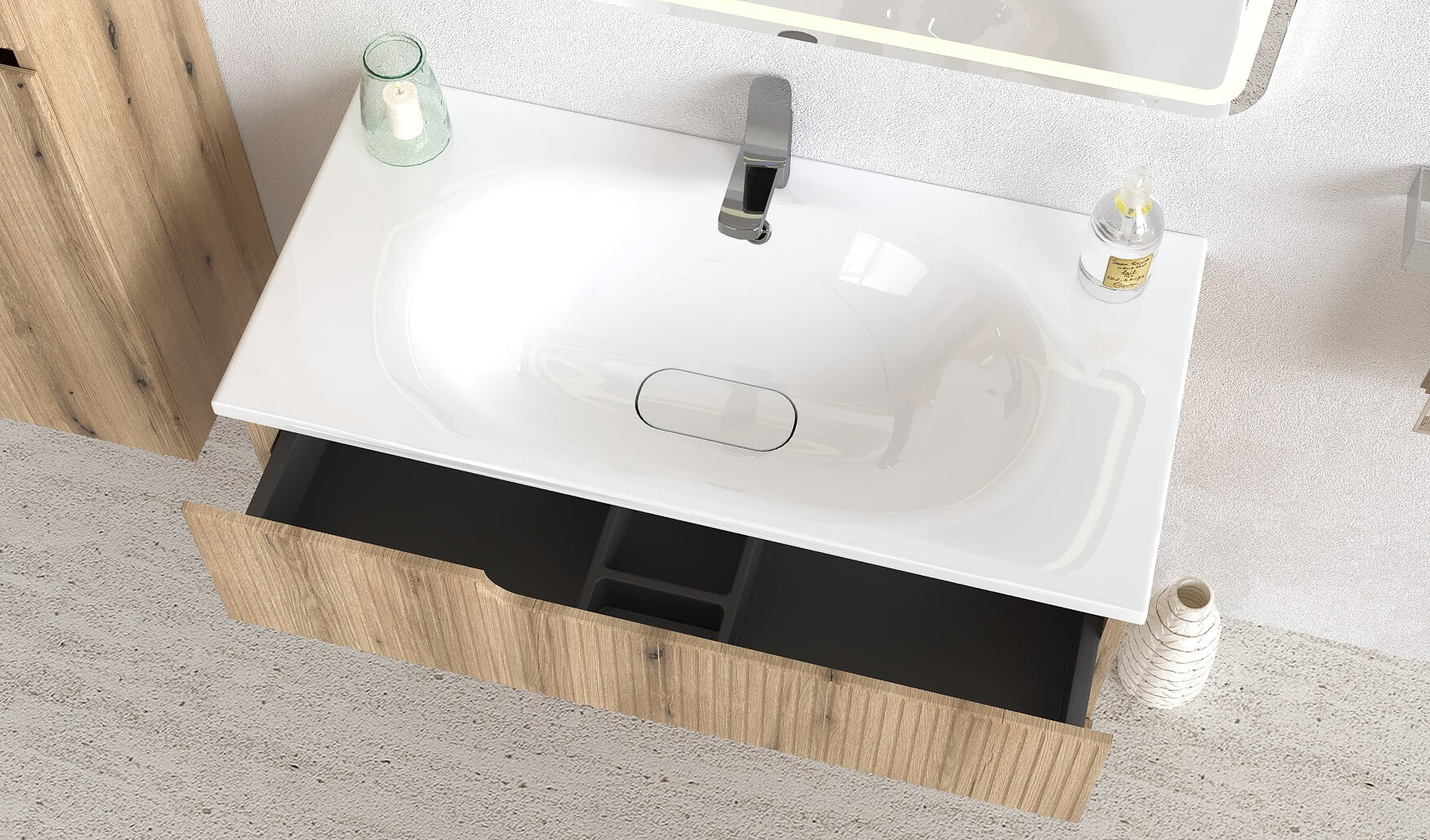 Sa dodatkom ogledala i vertikale iz iste kolekcije, moguće je kreirati harmoničan i funkcionalan ambijent.