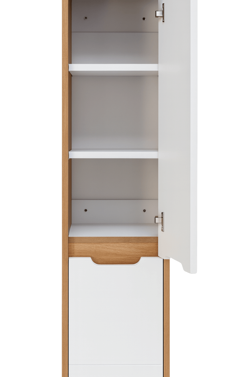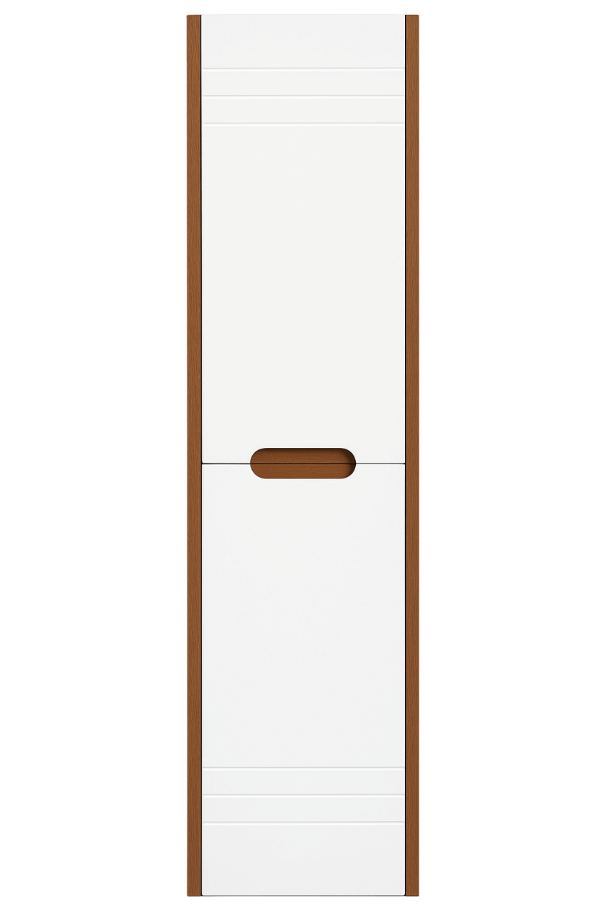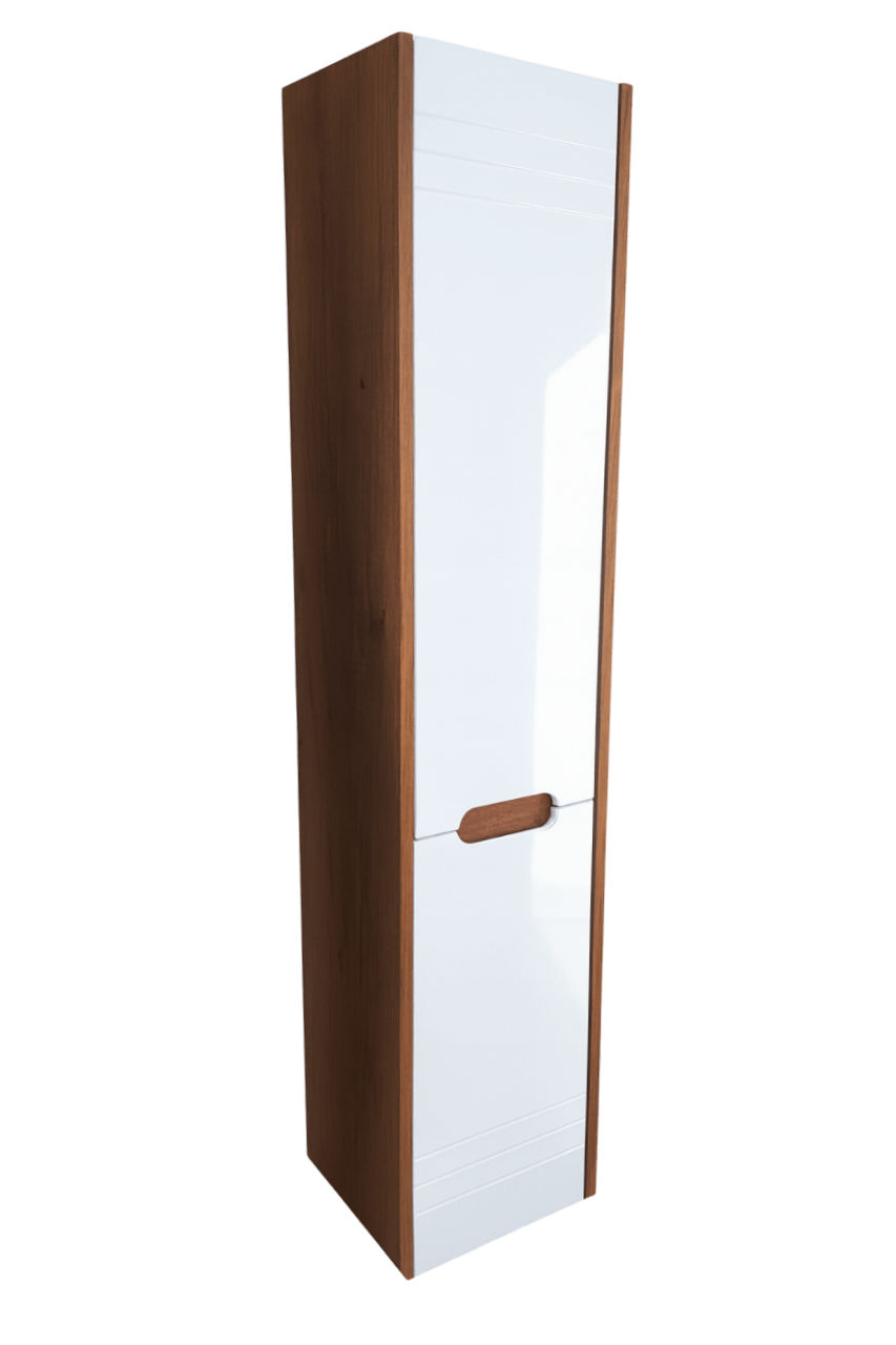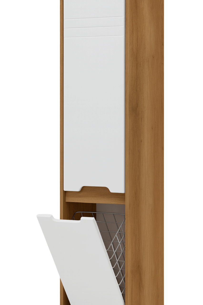 Izrađena od kombinacije iverice i frontova od medijapana, ova vertikala kombinuje dugotrajnost i otpornost na vlagu, što je čini savršenom za uslove u kupatilu.