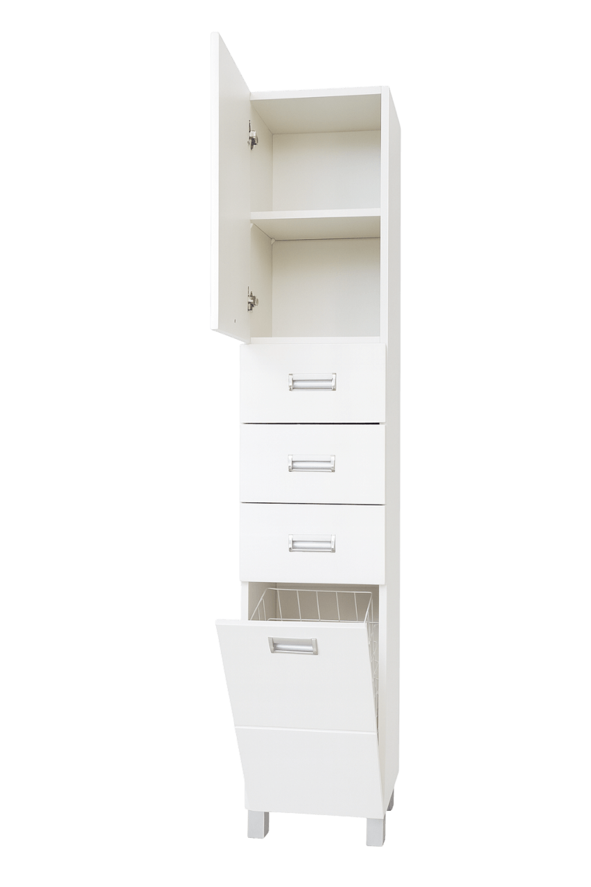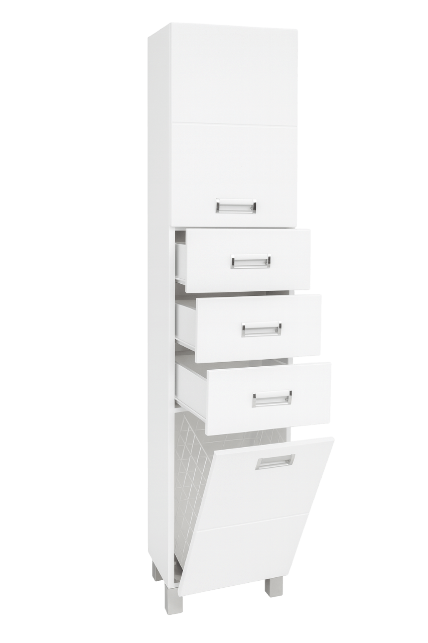 Integrisana korpa za veš omogućava diskretno odlaganje, dok više fioka i pregrada pružaju dodatni prostor za odlaganje kozmetike, peškira i drugih kupatilskih potrepština.