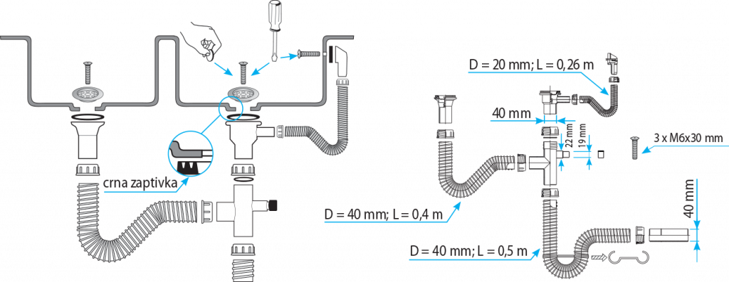 Zahvaljujući fleksibilnim cevima i univerzalnim priključcima Ø40 mm, montaža je brza i laka, bez potrebe za posebnim alatima.
