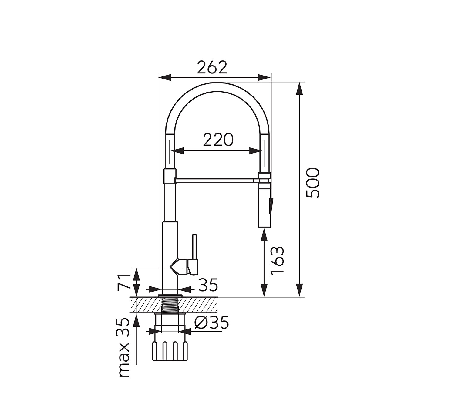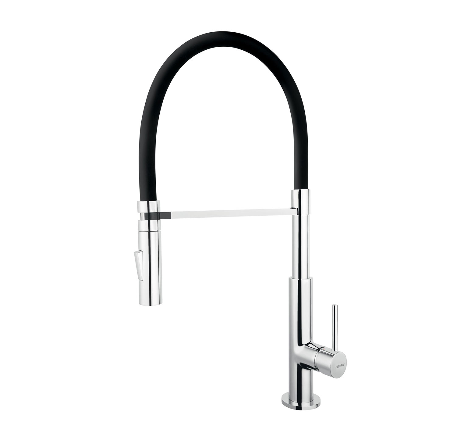 Visok i fleksibilan izliv u crnoj boji, dodatno ojačan metalnim nosačem, daje ovoj jednoručnoj slavini karakter koji podseća na profesionalne kuhinje – ali prilagođen kućnoj upotrebi.