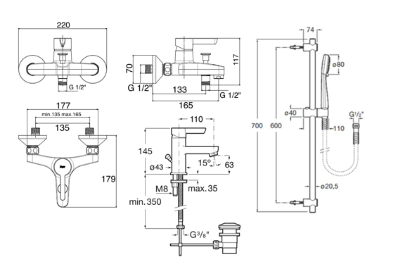 Set 3/1 baterija za kadu, lavabo i klizna šipka Saona